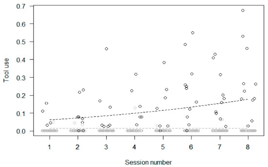 Tool use (i.e., proportion of scans where an individual engaged in tool use out of the total number of scans in which the subject was visible) as a function of time (i.e., enrichment session number) during the treatment phase. Circles represent individual responses in each enrichment session (i.e., in the morning and in the afternoon). Grey circles represent sessions in which the subjects did not participate in the enrichment task, and black circles those in which they participated. The dashed lines represent the fitted model, which is like Model 2b but unconditional on all the other predictors that were standardized. The black line represents the model for subjects participating in the enrichment task, and the grey line represents the model for those who did not participate in the task. Data were jittered horizontally to avoid overplotting.