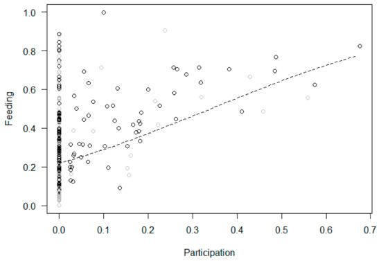 Feeding (i.e., proportion of scans that an individual was feeding, out of the total number of scans in which the subject was visible) as a function of participation (i.e., proportion of scans an individual interacted with the enrichment device in an enrichment session) during the treatment phase. Circles represent individual responses in each enrichment session in the morning (in black) and afternoon (in grey). The dashed line represents the fitted model, which is like Model 3b but unconditional on all the other predictors that were standardized.