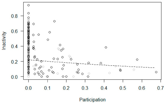 Inactivity (i.e., proportion of scans that an individual was inactive, out of the total number of scans in which the subject was visible) as a function of participation (i.e., proportion of scans an individual interacted with the enrichment device in an enrichment session) during the treatment phase. Circles represent individual responses in each enrichment session in the morning (in black) and afternoon (in grey). The dashed line represents the fitted model, which is like Model 4b but unconditional on all the other predictors that were standardized.