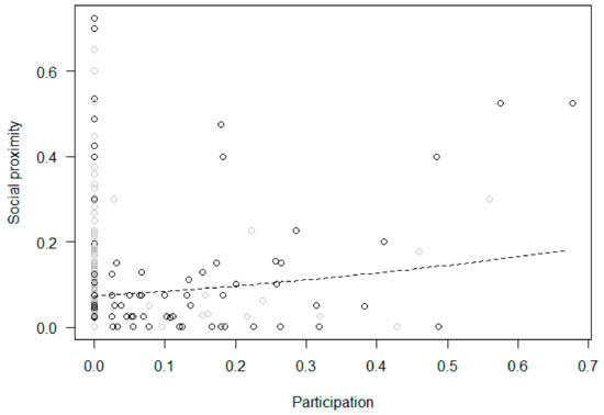 Social proximity (i.e., proportion of scans an individual was in social proximity, out of the total number of scans in which the subject was visible) as a function of participation (i.e., proportion of scans an individual interacted with the enrichment device in an enrichment session) during the treatment phase. Circles represent individual responses in each enrichment session in the morning (in black) and afternoon (in grey). The dashed line represents the fitted model, which is like Model 7b but unconditional on all the other predictors that were standardized.