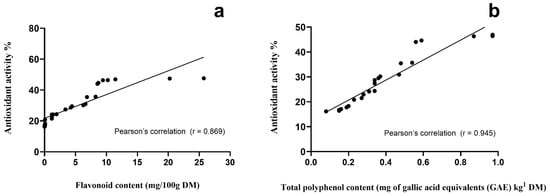 Pearson’s correlations of flavonoid (a) and total polyphenol (b) content versus antioxidant activity of vegetation species browsed/grazed by goats on semiarid rangelands.