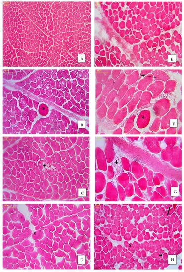 Microstructure of pectoral muscle of green-legged partridge (GP) chickens (A–D) and Ross 308 broilers chicken (E–H); HE stain; * giant fibres; +—necrotic fibres; S—fibre splitting; change shape of fibre (thick arrow); atrophic fibres (thin arrows); magnification ×100 (A,E,H); magnification ×200 (B–D,F,G).