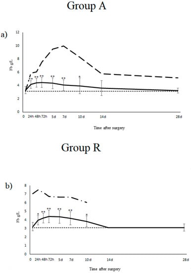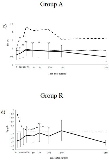 In group R (n = 12), the average concentration of Fb increased by 23.4% (p < 0.01) in the first 24 h after surgery, by 31.3% (p < 0.001) in 48 h and by 37.4% (p < 0.001) in 72 h compared to the initial value (Figure 1b). The average Hp concentration increased by 37.7% (p < 0.05) in t48 and by 57.3% (p < 0.01) from baseline in t72 (Figure 1d). An increase in Hp concentration in t24 was present but it was not statistically significant. The mean value of Fb and Hp began to decrease from d5 and on d14 did not differ significantly from the t0 value. There was no significant increase in the PI concentration over time.