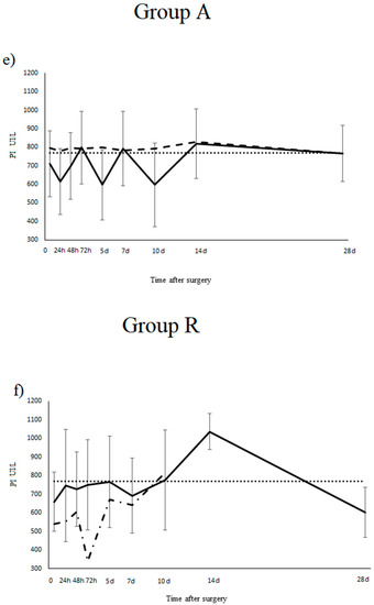 All statistical analyses were performed using STATISTICA (data analysis software system), version 13, TIBCO Software Inc., Palo Alto, CA, USA (2017) at a 5% significance level (p ≤ 0.05). The normality of the data was confirmed with Shapiro–Wilk test. Student’s t-test was used to test the significance of differences between the mean values in the groups. The test for dependent samples was used to compare paired values between time t0 and t24, t48, t72, td5, td7, td10, td14 and td28 within the same group (A/R) and the test for independent samples was used to assess these values between groups (A/R). Dynamic changes of the estimated APP were analyzed according to a time schedule using the General Linear Models procedure (GLM). The GLM procedure was also used to test the significance of the influence of the studied effects (sex, age, color, and interactions between them) on the concentrations of plasma inflammatory markers in the postoperative period. An analysis of variance (one-way ANOVA) was used to compare the same time point (t0) between groups (A/R/control). Post hoc cross-tests using Fisher’s Least Significant Difference (LSD) were performed to determine statistically significant differences between two groups if the null hypothesis about the equality of all means was rejected. The significant differences between the analyzed means were determined using the Duncan test. The results are presented in tables and figures as means, minimum and maximum values, as well as standard deviations (mean, min, max, SD).