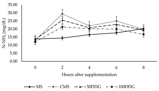 The interaction between the supplement and time of collection (p ≤ 0.05) was observed for N-NH3 (Figure 1). The average values of N-NH3 increased between 0 and 2 h after supplementation with supplements provided at 0.3% BW. After 2 h of supplementation, N-NH3 decreased, reaching values similar to the initial values after 8 h of supplementation. Supplementation with CMS promoted higher values of N-NH3 compared to the treatments with DDG. Additionally, the MS-animals’ maximum concentration of N-NH3 was seen 8 h after supplementation (20.28 mg/dL), whilst other supplements promoted the maximum concentration of N-NH3 2 h after supplementation.