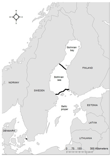 Figure 1. Three sampling areas in the Baltic Sea (Bothnian Bay, Bothnian Sea and Baltic Proper) along the Swedish Baltic coast denoted by black markings. The map was constructed in ArcMap 10.6 using a shapefile downloaded from HELCOM Map (metadata.helcom.fi/geonetwork/, accessed on 11 October 2021) and an ArcGIS online map (Europe-contours pays) from ESRI-France (25 January 2020).