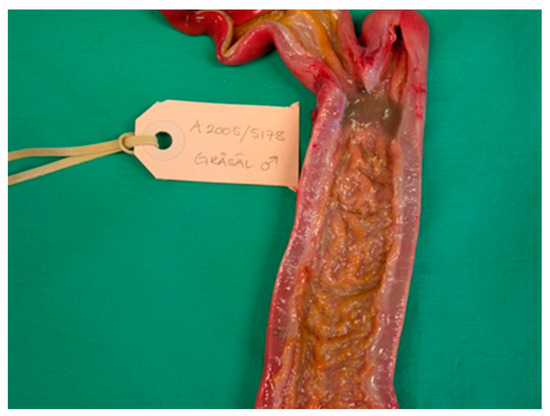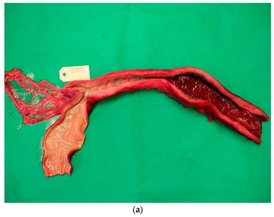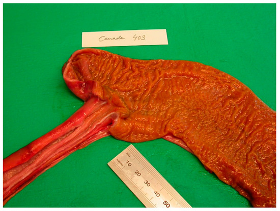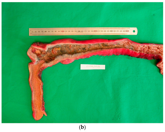 Figure 3. (a,b). Baltic grey seals with severe colonic (a) and caeco-colonic (b) ulcers. The muscular layer of the intestinal wall has thickened.