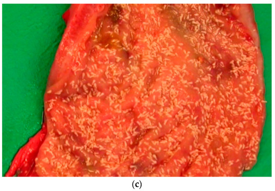 Figure 4. (ac). Intensity of colonic acanthocephalan parasites, estimated as slight (a) moderate (b) and high (c).