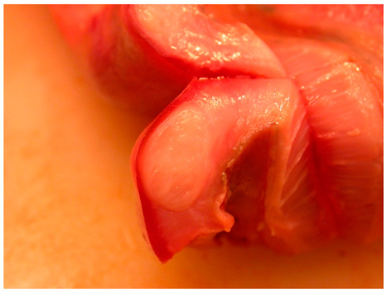 The intestinal lesions were mainly located in the ileocaeco-colonic region, predominantly in the anterior part of the colon. The intestinal lesions were solitary or multiple, often confluent areas with erosion of the mucosa. The erosions were mainly localized along the tips of the folds of the colon. The size of the intestinal ulcers could vary from a few millimetres in diameter (degree 1) to extended ulcers occupying large parts of the ileum and colon (degree 2–3). Old and recent haemorrhages were common in the ulcers and, in severe cases, also in the muscular layer of the affected area. The muscular layer of the diseased part of the intestine was often thickened. In the muscular layer, leiomyomas measuring 5–20 mm were found in a few cases (Figure 5). Perforation of the intestinal wall was the cause of death in 26 of the investigated Baltic grey seals (Figure 6). One seal was a yearling, and the other seals were 1–37 years old (17 males, 8 females).