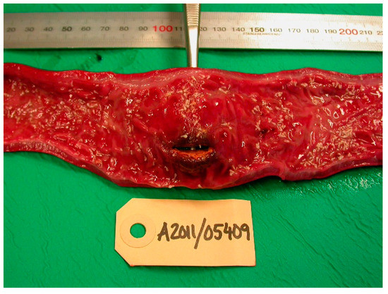 Figure 6. Perforation of the colonic wall in a Baltic grey seal.