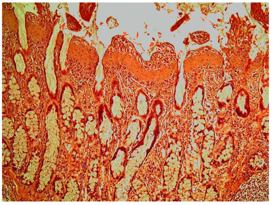 In the histological sections of two specimens with severe colonic ulcers, subepithelial, thickened villi showed a band of connective tissue (Figure 7) that stained positive with Masson´s trichrome for collagen. The subepithelial collagen band was evident in both the ileum and the colon.