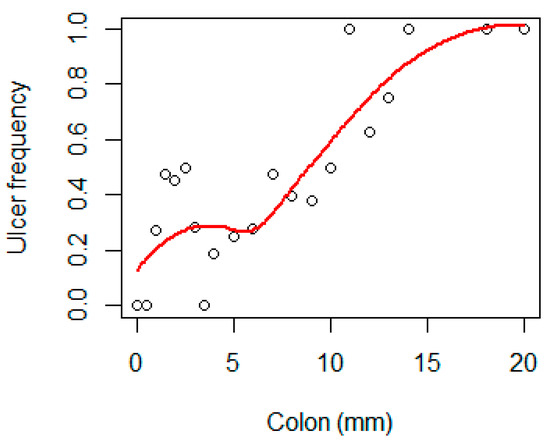Figure 8. The frequency of ulcer versus colonic muscular layer thickness. The red line represents a loess smoother line.