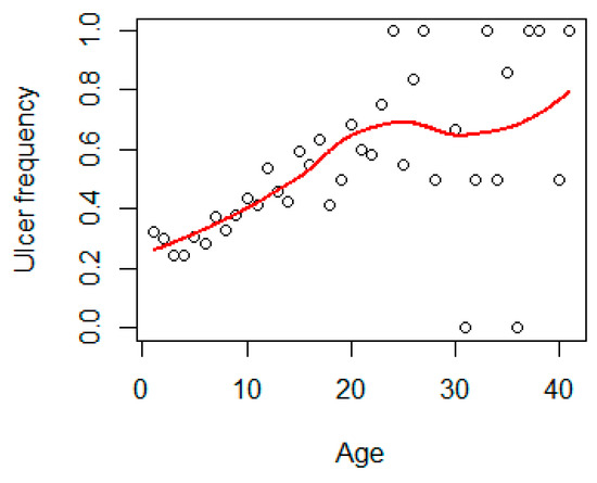 Figure 9. Mean frequency of ulcers versus age in Baltic grey seals. The red line is a loess smoother line.