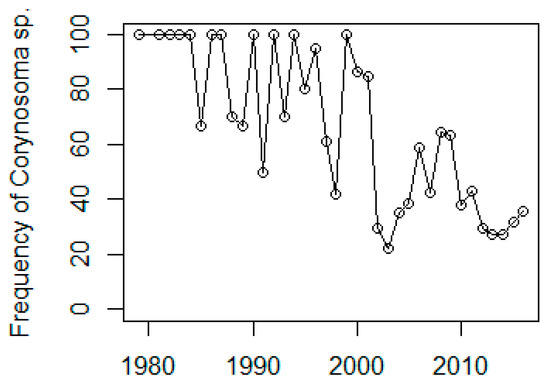 Figure 10. Frequency of moderate to high acanthocephalan parasite intensity versus year.