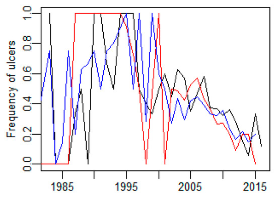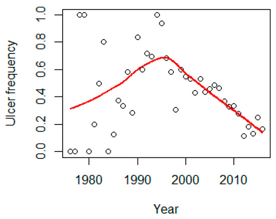 Figure 11. The frequency of ulcers increased up to the mid-1990s and then a decrease is seen. The red line is a loess smoother line.