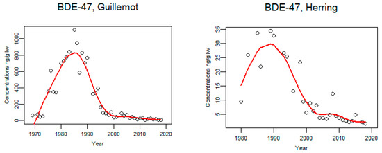 Figure 13. Time trends of BDE-47 (ng/g lw) in guillemot egg (n = 306) from the Baltic proper 1969–2018 and herring muscle from the Baltic 1980–2018 (median annual values from 4 localities, n = 217). The circles represent annual median values and the red line shows a smoother.