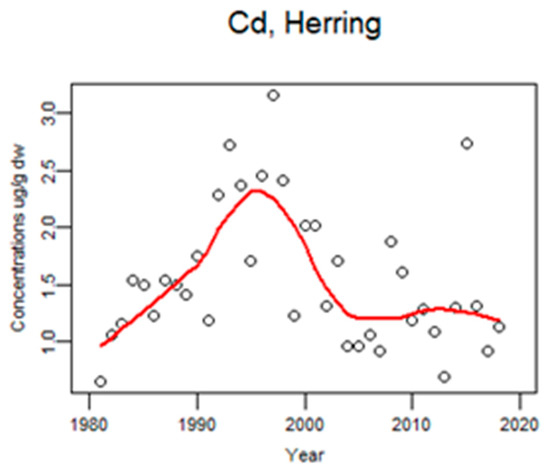 Figure 14. Time trends of Cd (ug/g dw) in herring liver from the Baltic 1981–2018 (median annual values from 4 localities, n = 1109). The circles represent annual median values and the red line shows a smoother.