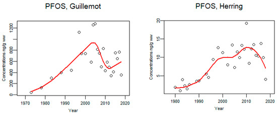 Figure 15. Time trends of PFOS (ng/g lw) in guillemot egg (n = 24) from, Baltic proper 1973–2018 and herring liver from the Baltic 1980–2018 (median annual values from 4 localities, (n = 123). The circles represent annual median values and the red line shows a smoother.