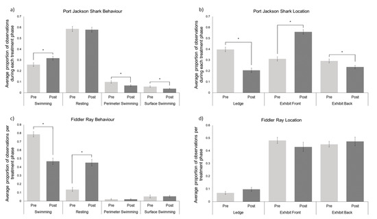 (a) The average proportion of time the Port Jackson sharks (n = 4) spent performing the different behaviours pre-post renovations. (b) The average proportion of time the Port Jackson sharks (n = 4) spent in each exhibit location pre-post renovations. (c) The average proportion of time the Southern fiddler ray (n = 1) spent performing the different behaviours pre-post renovations. (d) The average proportion of time the Southern fiddler ray (n = 1) spent in each exhibit location pre-post renovations. Pre-renovations means are represented by light grey bars and post-renovations are represented by dark grey bars for all panels. The error bars represent the SEM and the * indicate statistically significant differences (p < 0.05).