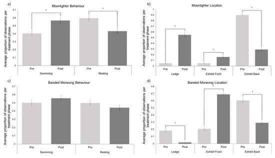 (a) The average proportion of time the moonlighter (n = 1) spent performing natural behaviours pre-post renovations. (b) The average proportion of time the moonlighter (n = 1) spent in each exhibit location pre-post renovations. (c) The average proportion of time the banded morwong (n = 1) spent performing natural behaviours pre-post renovations. (d) The average proportion of time the banded morwong (n = 1) spent in each exhibit location pre-post renovations. Pre-renovations means are represented by light grey bars and post-renovations are represented by dark grey bars for all panels. The error bars represent the SEM and the * indicate statistically significant differences (p < 0.05).