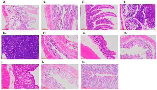 Sections of intestinal tissue samples observed by microscope (HE-staining, 100×). (A) The whole layer of coagulative necrosis of the duodenum wall in rabbits with diarrhea. (B) The whole layer of coagulative necrosis of the jejunum wall in rabbits with diarrhea. (C) The jejunum of healthy rabbits showed normal intestinal structure without obvious histopathological damage. (D) The number of lymphocytes in the lymphoid tissue of the lower ileum of diarrheal rabbits decreased seriously, forming a large number of cavities. (E) The lymphoid tissue under the ileum of healthy rabbits was rich and arranged in an orderly way. (F) The caecum of diarrheal rabbits had coagulative necrosis. (G) The intestinal tissue structure of healthy rabbits was normal without obvious histopathological damage. (H) The whole layer of coagulative necrosis of the colon wall in rabbits with diarrhea. (I) The structure of the colonic intestine in healthy rabbits was normal without obvious histopathological damage. (J) The whole layer of coagulative necrosis of the rectum wall in rabbits with diarrhea. (K) The structure of the rectum and intestines in healthy rabbits was normal without obvious histopathological damage.