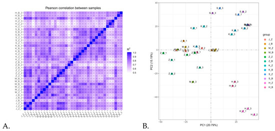 Quantitative analysis of each intestine sample. (A) Heat map of correlation between samples. The higher the correlation coefficient between samples, the closer the expression pattern is. (B) Principal component analysis result graph. Ideally, the intergroup samples in the PCA diagram should be scattered and the intra-group samples should be clustered together. S_Z: the duodenum of healthy rabbits, S_B: diarrhea in the duodenum of rabbits, H_Z: healthy rabbit ileum, H_B: diarrheal rabbit ileum, K_Z: healthy rabbit jejunum, K_B: rabbits with diarrheal jejunum, M_Z: healthy rabbit cecum, M_B: rabbits with diarrheal cecum, J_Z: healthy rabbit colon, J_B: colon of rabbits with diarrhea, Z_Z: healthy rabbit rectum, Z_B: rectum of rabbits with diarrhea.