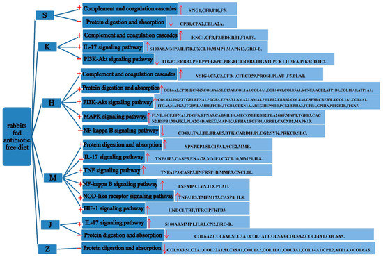 Moreover, the analysis identified 9, 21, 25, 5, 12, and 1 KEGG pathways that were significantly enriched in DEGs in comparison groups S_Z vs. S_B, K_Z vs. K_B, H_Z vs. H_B, M_Z vs. M_B, J_Z vs. J_B, and Z_Z vs. Z_B, respectively (Figure 5). The significantly enriched pathways in DEGs from comparison group S_Z vs. S_B mainly included the complement and coagulation cascades and protein digestion and absorption (Figure 6). The pathways significantly enriched in DEGs from comparison group K_Z vs. K_B mainly included complement and coagulation cascades, IL-17 signaling pathway, and PI3K-Akt signaling pathway. The significantly enriched pathways in DEGs from comparison group H_Z vs. H_B mainly included the complement and coagulation cascades, protein digestion and absorption, PI3K-Akt signaling pathway, MAPK signaling pathway, and NF-kappa B signaling pathway. The pathways that were significantly enriched in the DEGs from comparison group M_Z vs. M_B mainly included protein digestion and absorption, IL-17 signaling pathway, TNF signaling pathway, NF-kappa B signaling pathway, NOD-like receptor signaling pathway, and HIF-1 signaling pathway. The pathways that were significantly enriched in the DEGs from comparison group J_Z vs. J_B mainly included protein digestion and absorption, and IL-17 signaling pathway. The pathways that were significantly enriched in the DEGs from comparison group Z_Z vs. Z_B mainly included protein digestion and absorption, chemical carcinogenesis, metabolism of xenobiotics by cytochrome P450, and glycolysis/gluconeogenesis. KEGG pathways that were significantly enriched in more than three comparison groups included NF-kappa B signaling pathway, IL-17 signaling pathway, protein digestion and absorption, NOD-like receptor signaling pathway, metabolism of xenobiotics by cytochrome P450, chemical carcinogenesis, retinol metabolism, and glutathione metabolism. PI3K-Akt, NOD-like receptor, HIF-1, MAPK, and TNF signaling pathways play important roles in immune-related molecular pattern recognition, signal transduction, and host immune system regulation. These results provide important insights into the transcriptional mechanism of intestinal diarrhea induced by a no-antibiotic diet in rabbits.