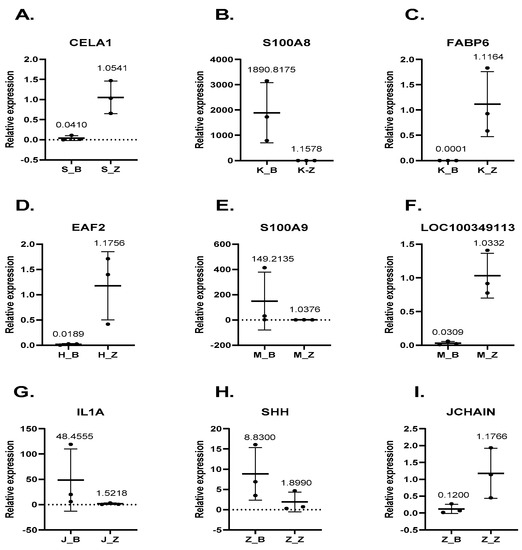 To validate the reproducibility and repeatability of DEGs identified from transcriptome sequencing, we randomly selected 10 genes, namely, CELA1, S100A8, FABP6, EAF2, S100A9, LOC100349113, IL1A, SHH, and JCHAIN, for RT-qPCR analysis (Figure 7). Our results showed that these genes were significantly differentially expressed and were consistently upregulated or downregulated with the gene expression changes based on RNA-seq, which indicated that the RNA-seq data were reliable.