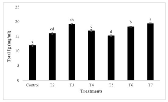 Immunoglobulins are natural antibodies that are produced in the absence of external antigenic stimuli, and this feature has become an important part of the non-specific immune system of fish [74]. Therefore, elevation of total Ig could be due to the improvement of immune parameters in response to the addition of synbiotic and/or Persian shallot to zebrafish diet [75].
