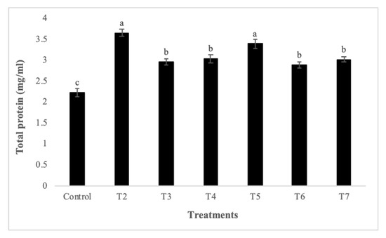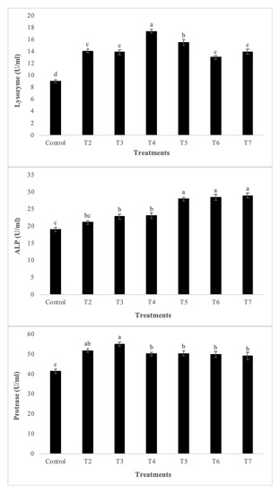 Diets supplemented with different levels of synbiotic Biomin®IMBO and/or Persian shallot significantly improved skin mucus immune parameters of zebrafish compared to fish fed on the control diet (p < 0.05; Figure 1). So that the highest lysozyme values were observed in T4 followed by T5, whereas the lowest value was recorded in the control group. Moreover, the highest and lowest total Ig levels were registered in T7 and T1, respectively. The T2 and T5 groups showed the highest and the control group showed the lowest skin mucus total protein levels. The maximum ALP levels were recorded in T7, T6, and T5, compared to the other groups (p < 0.05). Finally, the highest protease values were observed in T3 followed by T2, and its lowest value was recorded in the control group.