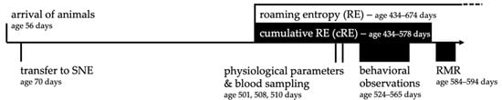 Analysis and illustration of data were done with the software environment R (v 3.6.3, R Foundation for Statistical Computing, Vienna, Austria, R Studio v 1.2.1335, RStudio, Inc., Boston, MA, USA). Continuous data (body weight and RE) were analyzed using linear models (‘lm()’ function). Related predictors were added as mixed effects to the regression models (package ‘lme4’ [], ‘lmer()’ function). Subsequent statistical comparison of different models (‘anova()’ function) identified the factors affecting the continuous data. Observed behavior was counted and analyzed as frequencies. Behavioral categories were compared descriptively. The physiological parameters were measured once and therefore also evaluated descriptively and considered in a final correlation analysis. Correlation analysis was done with the function ‘cor.test()’. Multiple testing of individual parameters in a correlation analysis is a known source of alpha inflation and therefore a cautious approach for interpreting findings is recommendable. One approach would be to follow the Bonferroni method or the extended Bonferroni–Holm procedure to correct for multiple testing. However, a large number of correlations as it is common in exploratory research would lead to an overly conservative corrected alpha. Due to the exploratory design of the correlation analysis, we refrained from controlling for type I error by alpha correction but advice to interpret the calculated p-values with caution. To show a possible stabilization of the animals’ behavior in the SNE, the animals’ activity data in the form of RE were subjected to a repeatability analysis. The repeatability value R was calculated over a time period of four weeks (week 1–4). The following repeatability value R for direct comparison was also calculated over four weeks starting one week offset (week 2–5). This principle was continued until the end of the entire measurement period of RE. The repeatability was estimated with a linear model analyzing the mean RE depending on the individual animal as an influencing factor. The calculation of the repeatability was done with the R package ‘rptR’ and the function ‘rpt()’.