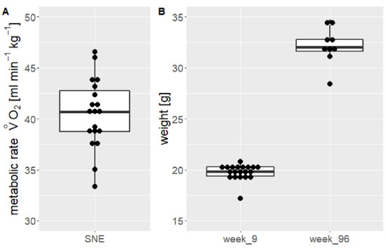 Summarizing boxplot of the resting metabolic rate (A) and the weight (B) of 19 female mice in the SNE. Metabolic rate was recorded at an age of 82–84 weeks. The weight is displayed at the animal age of 9 weeks and 96 weeks (start and end value).