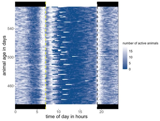 Heatmap of active animals in the SNE. Thy Y-axis shows the age of the animals in 136 consecutive days (day 434–day 570). Animals are recorded as active if there were at least a contact with two different antennas within a 15 min time period. The brighter a 15 min area, the more animals were recorded as active. The changing of the light/dark phase is marked by the dashed lines (yellow line = lights on, grey line = lights off).