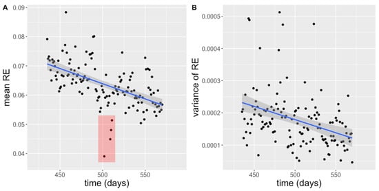 (A) Mean roaming entropy (RE) for 19 mice in the SNE over time with the change of the corresponding variance (B). The red area marks outliers in the values of the RE.