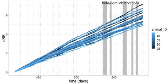 RE and thus cRE have been calculated daily for the activity during the dark phase (12 h), since activity during the light phases was influenced by the possible presence of caregivers or the performance of experiments. It can be assumed that during the dark phase undisturbed behavior is shown and thus a higher comparability between the individual, observed time periods arises.