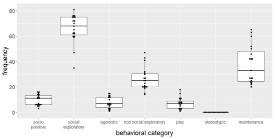 Behavioral observations were completed with 19 animals. During the different observation periods some individuals were at rest or outside the field of the observer’s view. Therefore, seven behavioral observation sessions were conducted in total. Overall, no stereotypic behavior was observed (Figure 7). The highest frequency was shown in social exploratory behavior including approaching and sniffing a cage mate. Non-social exploratory behavior was observed at one-third of the frequency of social exploratory behavior. Socio positive, agonistic, and play behavior reached similar low frequencies. The second most observed behavior was maintenance behavior including drinking and feeding. If the categories are examined combined as self-related and social behavior, the animals showed more social behavior (83.26 ± 13.91 per 30 min) than self-related behavior (71.00 ± 17.99 per 30 min).