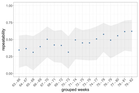 This stabilization of behavior over time was also shown by repeatability analysis of the RE (Figure 8). The repeatability value R was 0.34 at the beginning of the observation period and increased to 0.62 over time (F (1|15) = 37.08, p < 0.0001, adj. R2 = 0.69). This indicates that the behavior in the last four weeks is more stable on an individual level than in the first four weeks.