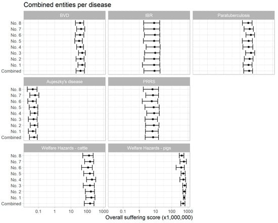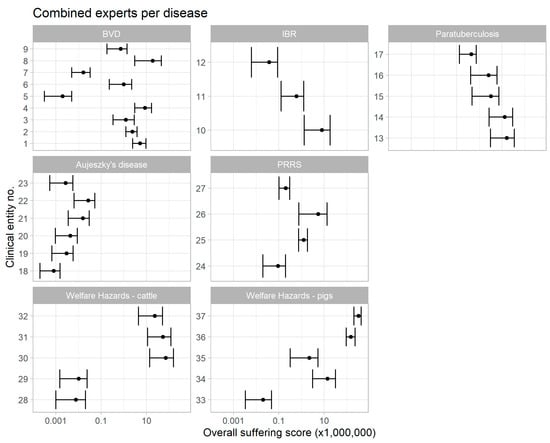Aggregated suffering scores (2.5, 50, and 97.5 percentiles) by disease condition. The disease entities and welfare hazards are numbered as follows: 1–9, BVD: (1) transient infection; (2) transient infection with erosions; (3) comorbidity (mastitis, retained placenta); (4) comorbidity (respiratory disease); (5) repeat breeding; (6) abortion; (7) congenital defects; (8) persistent infection (unthrifty animals); (9) persistent infection: mucosal disease; 10–12, IBR: (10) acute phase, respiratory version; (11) acute phase, gastro-intestinal version; (12) abortion; 13–17, MAP infection: (13) stage III with chronic wasting; (14) stage III with intermittent diarrhoea; (15) stage III with emaciation; (16) stage IV with pipe stream diarrhoea; (17) stage IV with lethargy; 18–23, Aujeszky’s disease: (18) encephalitis (weak piglets); (19) encephalitis (lethargic piglets); (20) encephalitis—weaners and finishers; (21) encephalitis—adults; (22) respiratory signs—finishers; (23) reproductive problems; 24–27, PRRS: (24) re-exposure in sows; (25) acute infection in piglets; (26) acute infection in weaners and finishers; (27) acute infection in sows and boars; 28–32, welfare hazards in cattle: (28) no access to water; (29) broken femur; (30) lying on concrete floor with no bedding material; (31) weather conditions are too hot; (32) separation of cow and calf; 33–37, welfare hazards in pigs: (33) broken femur; (34) weaning of piglets; (35) tail biting; (36) crating of sows; (37) feed restriction for sows.