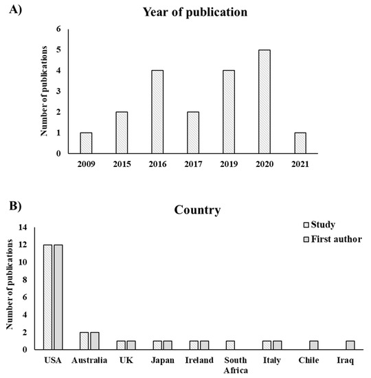 (A) Number of publications by year of publication; (B) country of the study and country of the first author’s affiliation. Publications can have more than one country for the first author.