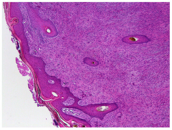 Paraffin tissue blocks containing formalin-fixed samples of equine sarcoids were identified by searching the databases of the Pathology Department at Massey University and Gribbles Veterinary Ltd, New Zealand. Samples were subclassified by the region of New Zealand that the sample was submitted from. Sarcoids from one region were also grouped into those submitted between 1996 and 2000, and those submitted between 2015 and 2020. The initial histological diagnosis was used to identify equine sarcoids. A hematoxylin and eosin-stained slide was subsequently examined by a veterinary pathologist boarded by the American College of Veterinary Pathologists to confirm this diagnosis (Figure 1).