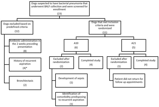 Flow chart indicating patient selection for study enrollment. Numbers in parentheses indicate the number of dogs. A10, patients received 10 days of antibiotics and 11 days of placebo; A21, patients received 21 days of antibiotics; BALF, bronchoalveolar lavage fluid. * Two out of four dogs with historical recurrent aspiration also received antibiotics in the 2 weeks preceding presentation.