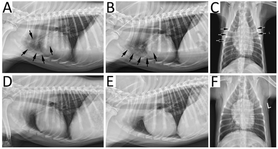 Radiographic resolution of bacterial pneumonia in a 9-month-old male neutered Golden Retriever dog. At initial presentation, right lateral (A), left lateral (B) and ventrodorsal (C) recumbent radiographic projections demonstrated an alveolar pattern (arrows) in the cranial lung fields characterized by increased opacification, air bronchograms and indistinct pulmonary vasculature. Since both the cranial segment of the left cranial lung lobe and right cranial lung lobe were affected, a global radiographic score of 4 was assigned, corresponding to multifocal consolidation. After a full course of therapy, right lateral (D), left lateral (E) and ventrodorsal (F) recumbent projections show resolution of lung lesions and thus, a global radiographic score of 1 was given.