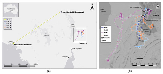 (a) Movement of feral cat (AC1) collared at Arid Recovery, South Australia, with trap site and site of last capture. The location of (b) is indicated with the box; (b) Movement tracks of the four feral cats collared in the Ikara-Flinders Ranges National Park (IFRNP), South Australia, with trap sites (☆) and site of last capture/death (X). Dark blue = Cat 1; Light blue = Cat 2; Purple = Cat 3; Orange = Cat 4. The location of Hawker township, Arkaba Conservancy, Wilpena Pound and the two gorges incising the Heyson Range are shown. The National Park is highlighted in dark grey. Base image: (a) ESRI Grey/QGIS; (b) Stamen/QGIS [37]. Map created using the Free and Open Source QGIS.
