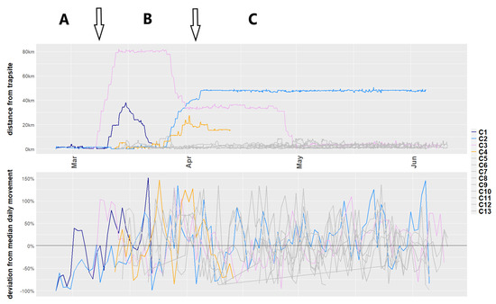 Movement summary over time (February to June 2020) of the feral cats captured in the IFRNP (Dark Blue = Cat 1; Light blue = Cat 2; Purple = Cat 3; Orange = Cat 4). Arrows indicating change in movement behaviour between sedentary (A and C) and long-distance movements (B).