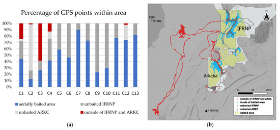 (a) Proportions of GPS points of the collared feral cats that fell within the aerially baited zone, the Ikara-Flinders Ranges National Park (IFRNP), Arkaba Conservancy (ARKC) or outside of the National Park and Arkaba; (b) GPS points of the feral cats that were collared in 2020 falling outside (red) of the conservation areas IFRNP and Arkaba and within (grey). GPS points that were in the aerially Eradicat®-baited area are marked in blue. The National Park and Arkaba are highlighted in white. Base image: Stamen/QGIS [37]. Map created using the Free and Open Source QGIS.