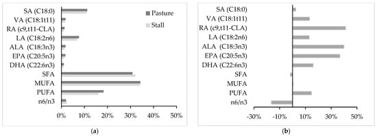 Effect of pasture- or stall-fed mothers on intramuscular fatty acid profile of suckling lamb meat. −Data are reported as % of total fatty acids (a) and as the proportional difference (%) between the pasture group and the control group (b). SA = stearic acid (C18:0), VA = vaccenic acid (C18:1t11), RA = rumenic acid (c9,t11-CLA), LA = linoleic acid (C18:2n6), ALA = α-linolenic acid (C18:3n3), EPA = eicosapentaenoic acid (C20:5n3), DHA = docosahexaenoic acid (C22:6n3), SFA = saturated fatty acids, MUFA = monounsaturated fatty acids, PUFA = polyunsaturated fatty acids. References: [11,67,70,71,72,73].