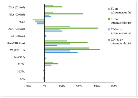 Effect of linseed oil (LIN-oil) or extruded linseed (EL) on intramuscular and subcutaneous fatty acid profile of suckling lamb meat. Data are reported as the proportional difference (%) between the treatment group and the control group. DHA = docosahexaenoic acid (C22:6n3), EPA = eicosapentaenoic acid (C20:5n3), ALA = α-linolenic acid (C18:3n3), LA = linoleic acid (C18:2n6), RA = rumenic acid (c9,t11-CLA), VA = vaccenic acid (C18:1t11), SA = stearic acid (C18:0), PUFA = polyunsaturated fatty acids, MUFA = monounsaturated fatty acids, SFA = saturated fatty acids. References: [89,90].