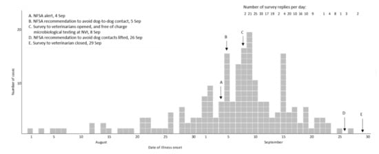 To generate hypotheses on common exposures, an online survey (www.questback.com, accessed on 1 November 2021) was distributed by e-mail on the 5 September to 25 owners of dogs that fit the case description. The questions (n = 42) included date of onset of disease, breed, age, clinical symptoms, contacts with other dogs, postal code of household, food and treats, visited locations, and activities. Several questions were open-ended. The survey was closed 7 September and summarised.