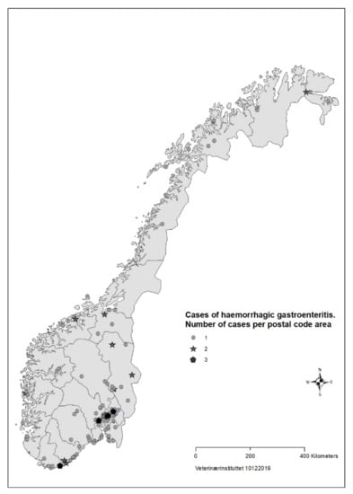 Because no specific pathogen or toxin had been detected in sick dogs, the case definition was based on clinical findings: “Dog in Norway presenting with acute haemorrhagic diarrhoea with an onset 1 August 2019 or later, and reported to NVI or NFSA by a veterinarian”. The term “acute haemorrhagic diarrhoea” (AHD) was considered to best describe the clinical picture.