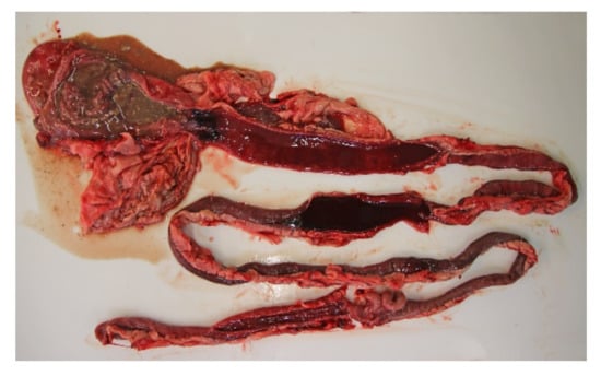 All of the 18 necropsied dogs were in normal or above average nutritional status with a weight range of 2.1 kg to 27 kg, and mean and median weights of 9.3 kg and 10.7 kg, respectively. A total of seven dogs were moderately to severely dehydrated, and several dogs had blood-stained faeces in the perineal coat. Most dogs had a brown and watery stomach content, and a brown-red discoloration of the gastric mucosa. The small intestinal content was fluid and deeply red blood-stained (Figure 3). The content of the large intestines was sparse, but likewise fluid and dark red. The intestinal mucosa was brown or dark red to violet, smooth and glossy, and in most cases the changes involved the whole intestinal tract.